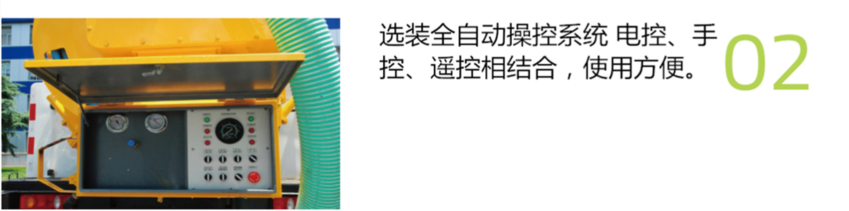 ● 操纵装置:喷头和胶管的前进、后退及速度调节采用手控,其它控制均采用电控。吸污管旋转臂架的旋转、变幅、 伸缩,污水罐后盖的开闭、倾翻复位等除电控外,还配有无线遥控。