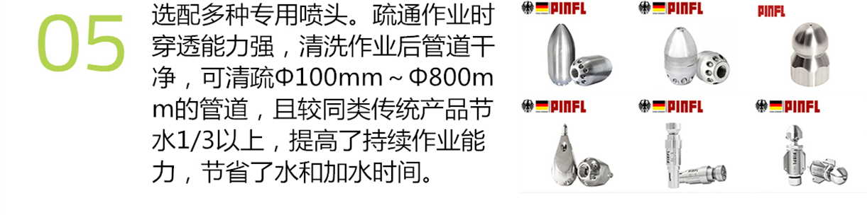 ● 标配合资喷头: 三角形喷头:同时向前向后喷射。适用于完全堵塞的管道。 蘑菇形喷头:喷嘴以两种角度布置,有较大的推力,用于有油脂的管道。 炸弹形喷头: 喷嘴与喷头轴线成15°或30°夹角,通常情况下使用。